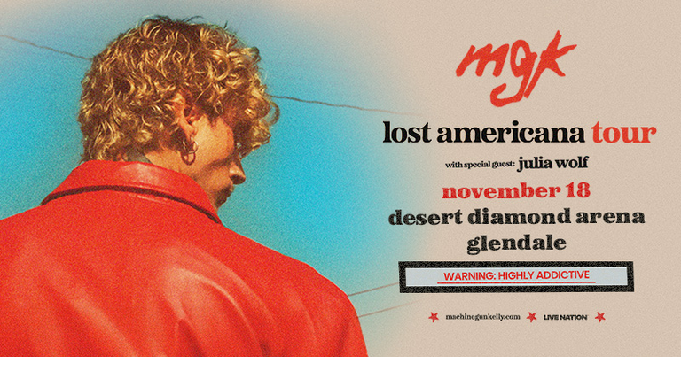 mgk is bringing his "Lost Americana Tour," to Desert Diamond Arena November 18th with special guest Julia Wolf! Tickets on sale next Thursday, September 25th @ noon PT at Ticketmaster.com!
