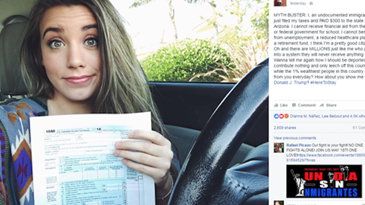 "MYTH BUSTER: I, an undocumented immigrant, just filed my taxes and PAID $300 to the state of Arizona. I cannot receive financial aid from the state or federal government for school, I cannot benefit from unemployment, a reduced healthcare plan, or a retirement fund. I think I'm a pretty good citizen. Oh and there are MILLIONS just like me who pay into a system they will never receive anything from. Wanna tell me again how I should be deported, contribute nothing and only leech off this country while the 1% wealthiest people in this country steal from you everyday? How about you show me yours Donald J. Trump? #HereToStay"
