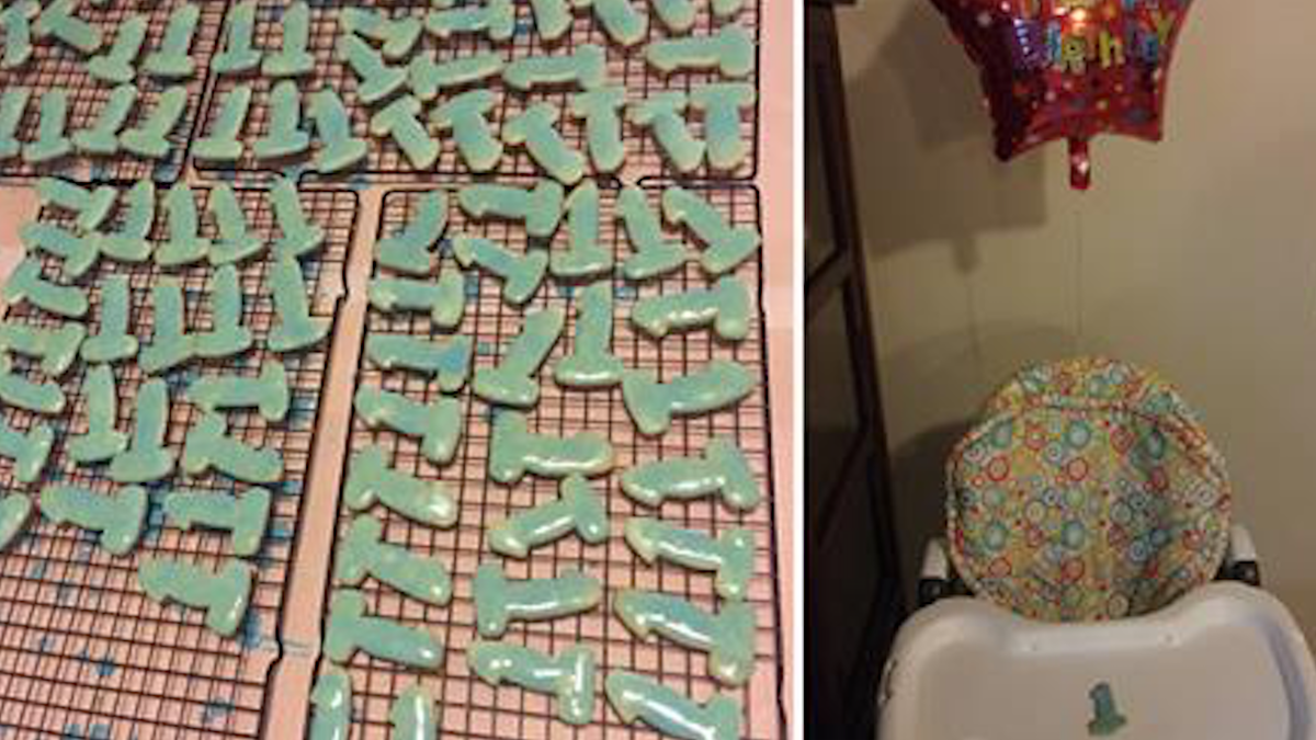A couple was planning their 11-month-old's birthday so they decided to make cookies shaped in the birthday year. They used the "1" from an old set of cookie stencils and made a total of 189 cookies for the party.